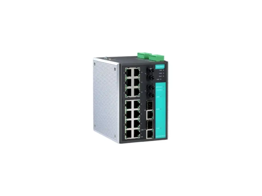 EDS-518A-MM-ST-T: L2 managed, 14× 10/100BaseT(X) + 2× 100BaseFX (MM, ST) + 2× 100/1000BaseSFP (combo); 12/24/48 V DC (redund.); −40…+75 °C; Turbo Ring/Chain, RSTP