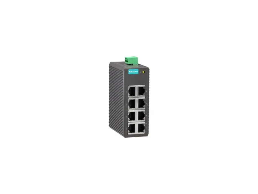 EDS-208 – 8× 10/100 RJ45, QoS/storm (DIP), alarm relay, dual 12/24/48 VDC (9.6–60 VDC operation), −10…60 °C