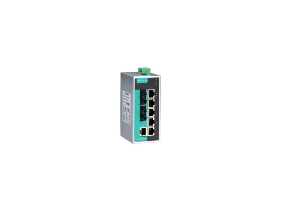 EDS-208A-MM-ST-T – 6× 10/100 RJ45 + 2× 100BaseFX MM (ST), QoS/storm (DIP), alarm relay, dual 12/24/48 VDC (9.6–60 VDC operation), −40…75 °C