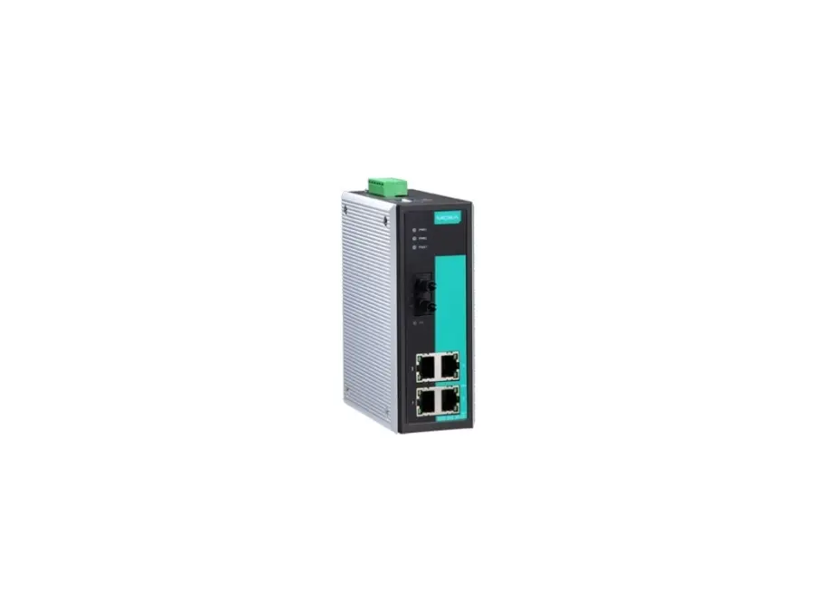 EDS-305-M-ST – 4× 10/100 RJ45 + 1× 100BaseFX MM (ST), QoS/storm (DIP), alarm relay, dual 24 VDC (12–48 VDC operation), −10…60 °C
