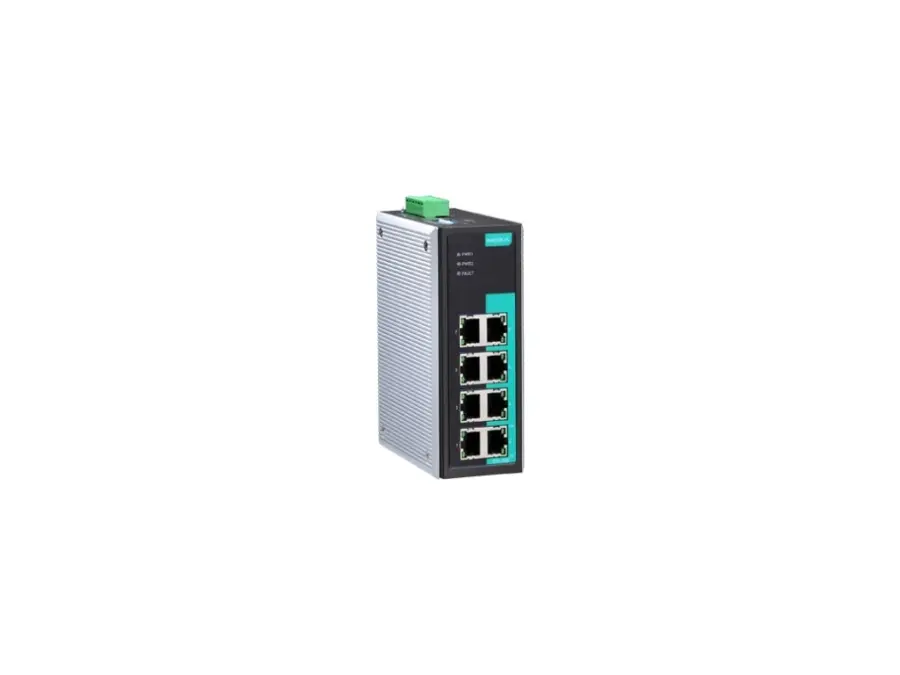 EDS-308 – 8× 10/100 RJ45, QoS/storm (DIP), alarm relay, dual 12/24/48 VDC (9.6–60 VDC operation), −10…60 °C