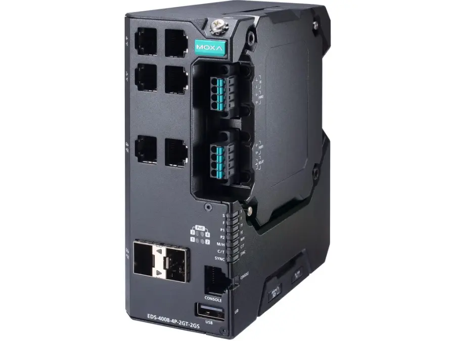 EDS-4008-4P-2GT-2GS-LVB: L2 managed, 4× 10/100 PoE/PoE+ + 2× 10/100/1000BaseT(X) + 2× 100/1000BaseSFP; power supply 12/24/48 V DC (redundant); −10…+60 °C; IEC 62443-4-2; Turbo Ring/Chain, RSTP