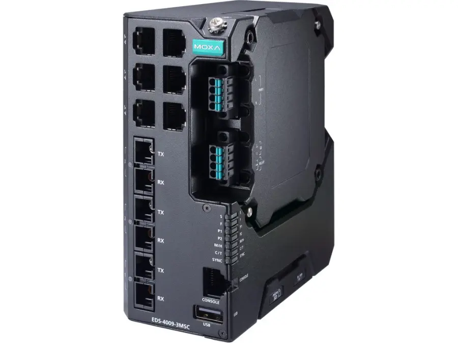 EDS-4009-3MSC-LV-T: 9-port L2 managed, 6× 10/100BaseT(X) + 3× 100BaseFX (MM, SC); 12/24/48 V DC power supply (redundant); −40…+75 °C; Turbo Ring/Chain, RSTP; IEC 62443-4-2