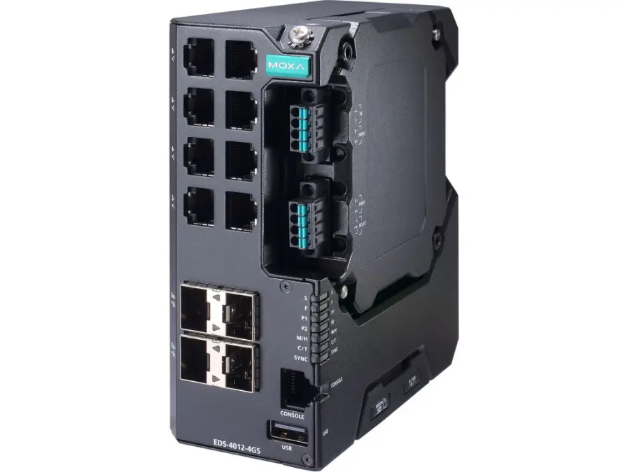 EDS-4012-4GS-HV-T: 12-port L2 managed, 8× 10/100BaseT(X) + 4× 100/1000BaseSFP; power supply 110/220 VAC/VDC (redundant); −40…+75 °C; Turbo Ring/Chain, RSTP; IEC 62443-4-2