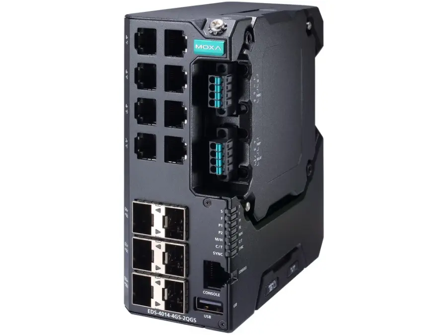 EDS-4014-4GS-2QGS-LV-T: 8× 10/100 RJ‑45 + 4× 1G SFP + 2× 2.5G SFP; 12/24/48 V DC; −40…+75 °C; Turbo Ring/Chain, RSTP; IEC 62443-4-2