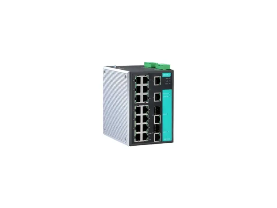 EDS-518A-T: L2 managed, 16× 10/100BaseT(X) + 2× 100/1000BaseSFP (combo); 12/24/48 V DC (redundant); −40…+75 °C; Turbo Ring/Chain, RSTP
