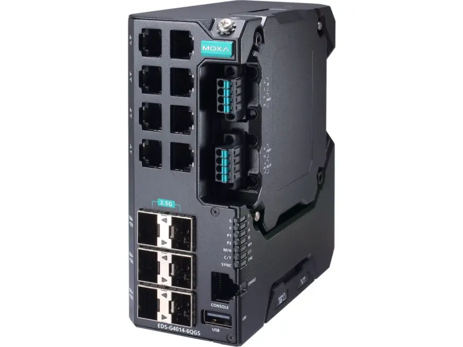 EDS-G4014-6QGS-HV: 8× 1G RJ‑45 + 6× 2.5G SFP; 110/220 VAC/VDC; −10…+60 °C; Turbo Ring/Chain, RSTP; IEC 62443‑4‑2