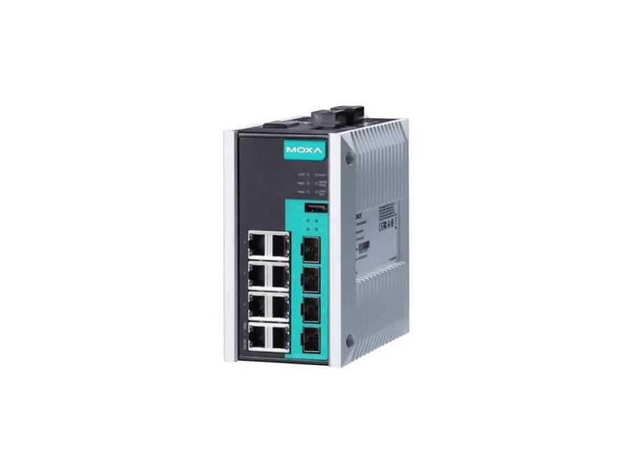 EDS-G512E-4GSFP: L2 managed, 8× 10/100/1000BaseT(X) + 4× 100/1000BaseSFP; 12/24/48 V DC (redundant); −10…+60 °C; Turbo Ring/Chain, RSTP