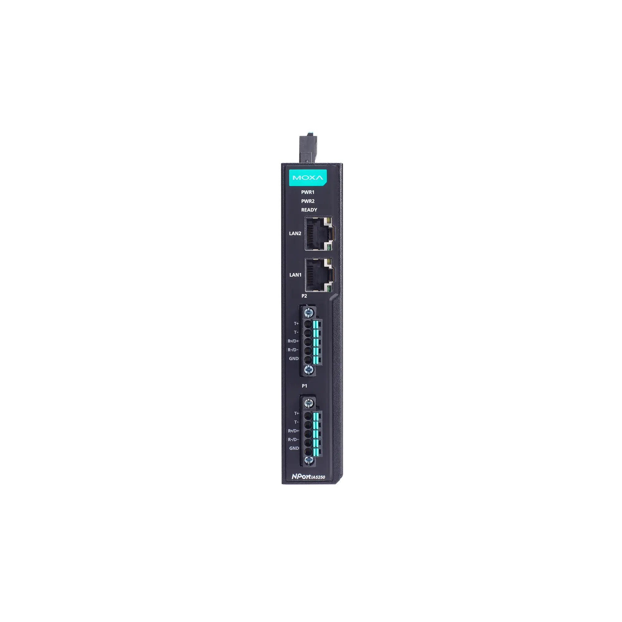 Serial device server – 2nd Gen 2-port RS-232/422/485 DIN-rail serial device server with 2 RJ45 ports, 2 5-pin terminal blocks, -40 to 75°C operating temperature