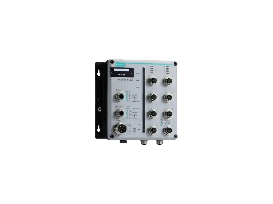 TN-5510A-2GTXBP-WV-CT-T – 8× FE M12 D, 2× 1G M12 X-coded (bypass relay), EN 50155, 24/36/48/72/96/110 VDC, isolated; operation 16.8–137.5 VDC, −40…75 °C
