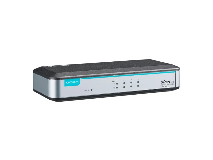 UPort 2410: **4× RS-232 ↔ USB**; **USB 1.1/2.0**, bus-powered; **up to 921.6 kbps**