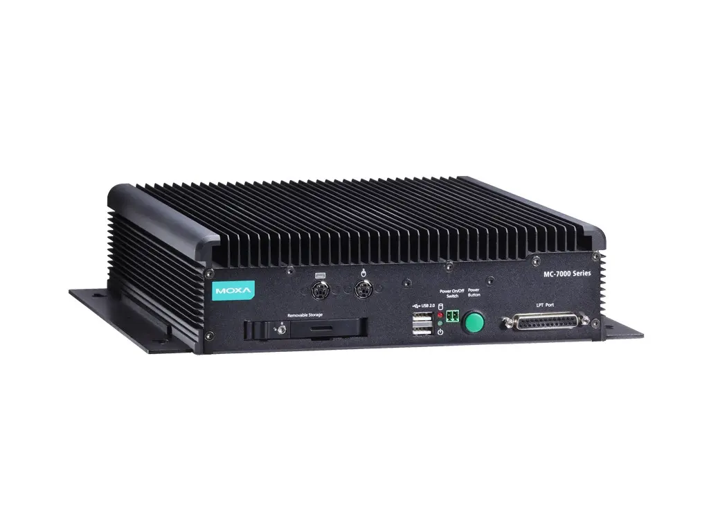 x86-based industrial computer with IntelR Celeron 1047UE processor, fanless, wide temperature, 4 serial ports, 4 Gigabit Ethernet ports, 6 USB hosts, VGA/DVI, and DC power input