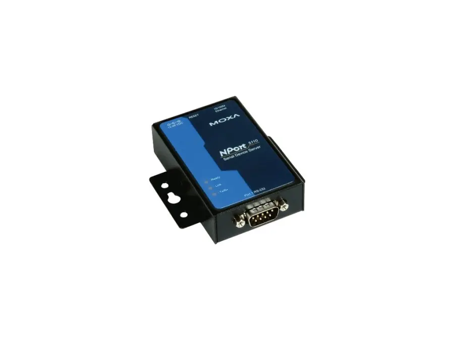 NPort 5110: **1× RS‑232 → Ethernet**, **1× 10/100 RJ‑45**; **12–48 V DC**; 0…+55 °C