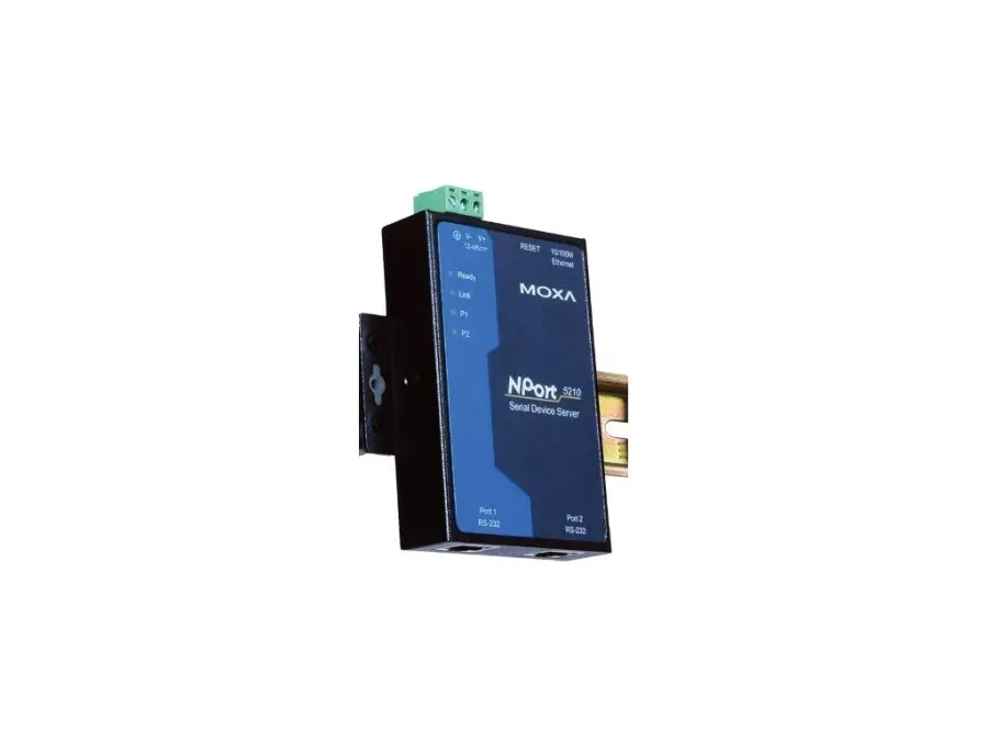 NPort 5210-T: **2× RS‑232 → Ethernet**, **1× 10/100 RJ‑45**; napájení 12–48 V DC; −40…+75 °C