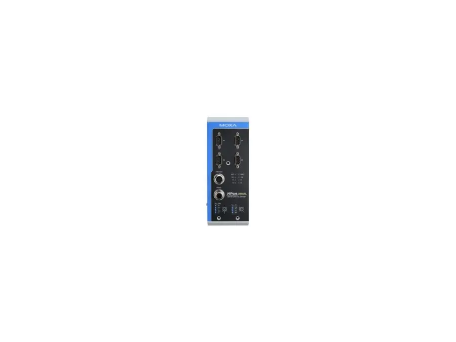 NPort 5450AI-M12: **4× RS‑232/422/485 → Ethernet**, 1× 10/100Base‑T(X) (M12, D‑coded); napájení M12 napájecí vstup (DC); −25…+55 °C